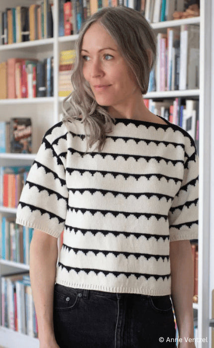 The Robinia Tee is a simple T-shirt with an elegant, multicolored pattern. It is knit from the top down. First, the front and back are worked in rows before being joined to form the body, which is then worked in the round. Stitches are picked up at the armholes to create the sleeves, which are finished with a twisted rib cuff. Short rows on the front, back, and sleeves ensure a perfect fit.